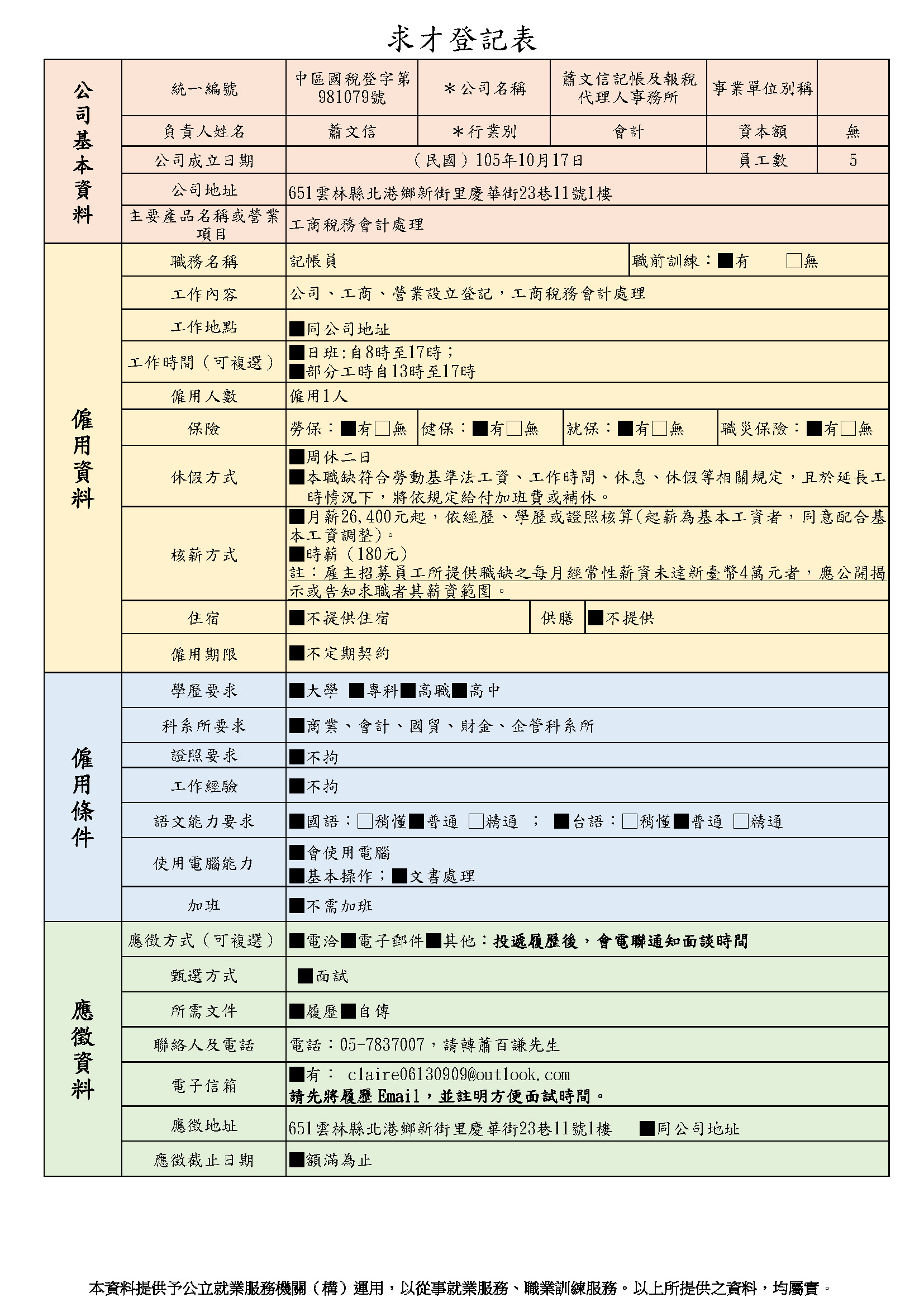 蕭文信記帳及報稅代理人事務所徵才訊息
