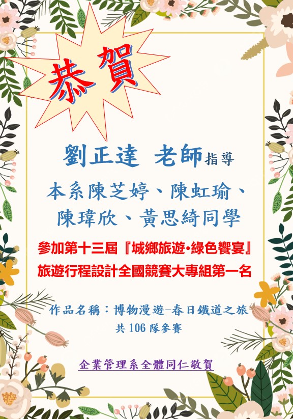 【112榮譽榜】賀!劉正達老師指導本系陳芝婷,陳虹瑜,陳瑋欣,黃思綺同學參加"第十三屆城鄉旅遊綠色饗宴-旅遊行程設計全國競賽大專組"榮獲第一名。...