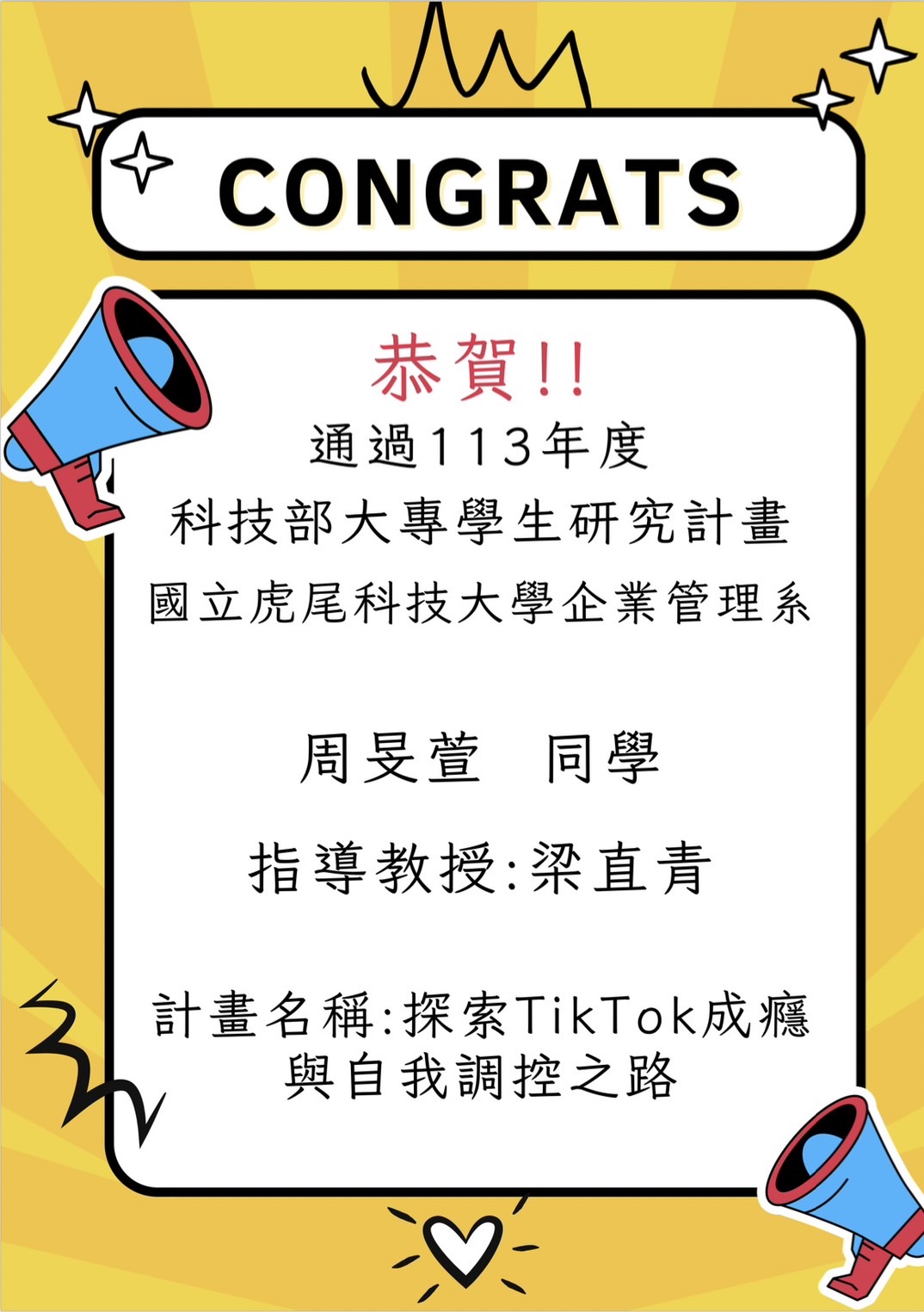 【112榮譽榜】賀!梁直青老師指導本系周旻萱同學通過"113年度科技部大專學生研究計畫"。...