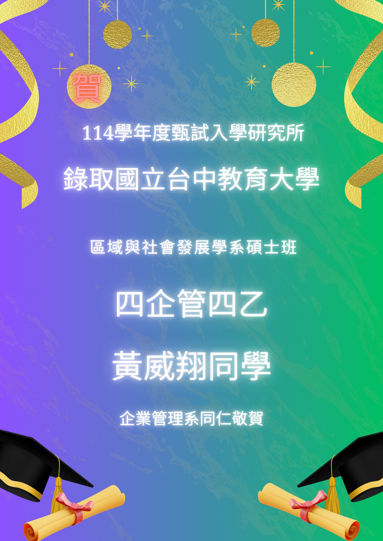 【113榮譽榜】恭喜黃威翔同學錄取國立台中教育大學碩士班